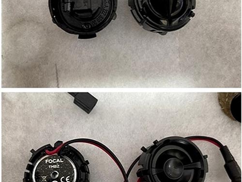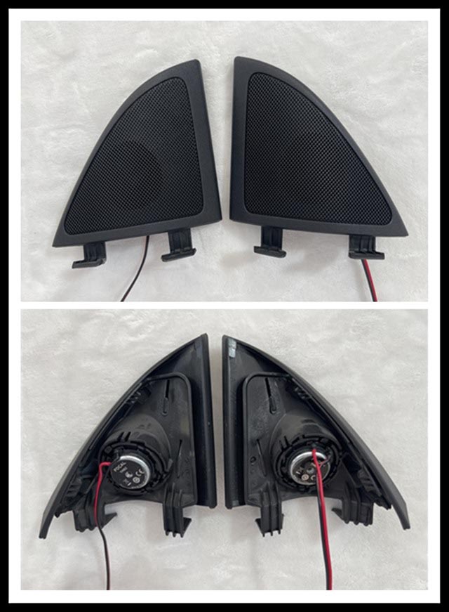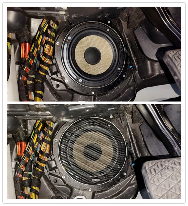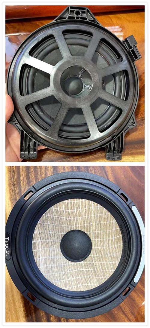 如圖可見,拆下來的原車喇叭做工粗糙且偷工減料。為此,改裝師選用法國勁浪專車專用喇叭來做音響升級,是根據奔馳原車結構特點進行設計,所有喇叭原位安裝,不破壞內飾,不影響線路。滿足車主既想提升音質,又不想破壞原車內飾的兩大要求。