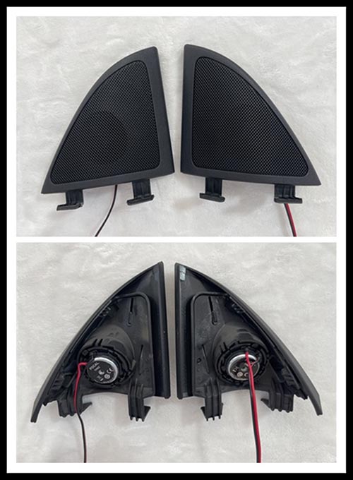 原車喇叭(左)與勁浪專車專用中音(右)正背面對比照。
