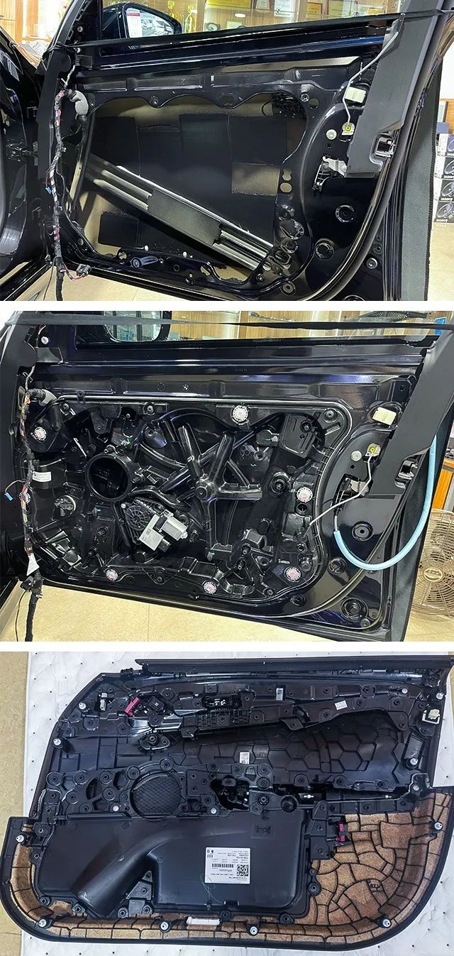 以下圖片所示,可以知道原車門板隔音不足,風噪很容易通過門板傳入進來,對音響品質產生影響。所以我們的改裝師使用大能藍金剛,對前后門板做了雙層隔音處理,從而減少了噪聲對音響品質的干擾。