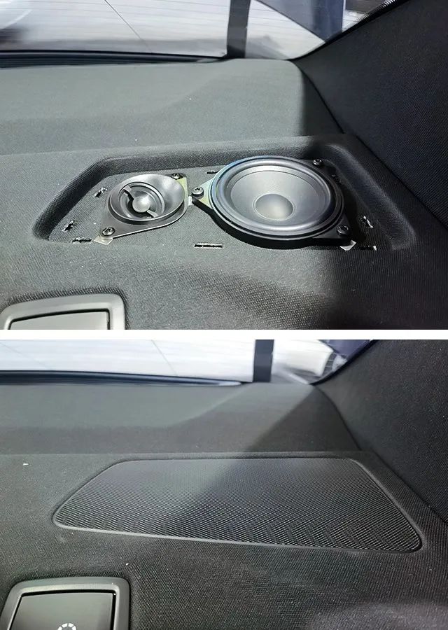 根據車主的聽音喜好,將前聲場喇叭替換成勁浪IS BMW 100L兩分頻套裝和勁浪 I SUB BMW4超低音。勁浪IS BMW 100L的高音讓不少車主魂牽夢繞,喜歡音樂的寶馬車主也被深深吸引住。改裝師將其高音單元安裝于三角位處,可以獲得更加寬廣的聲場同時不對線路造成過多的影響;中低音單元則安裝在門板原位,與高音喇叭處于同一平面,讓高、中低音頻段有更好的銜接;勁浪 I SUB BMW4超低音同樣選擇原位安裝在座位下方,不會對原車的線路造成影響。