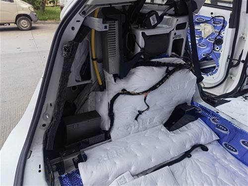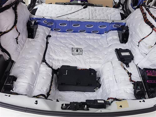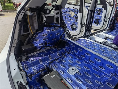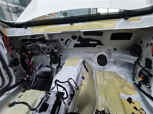 汽車在路面上行駛時也有明顯的低頻共振噪音影響著車主的駕駛感受,此噪音是由防火墻、車底盤,后尾箱傳遞到駕駛艙內的。因此,海林技師選擇大能藍金剛、溫莎吸音棉、低頻王分別對車底盤,后尾箱、防火墻部位進行雙層隔音降噪處理,有效阻隔車內低頻共振噪音。