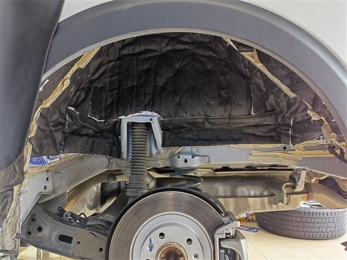 針對標致5008汽車內部的胎噪問題,海林改裝師也是著重的加強處理,使用藍金剛+超級溫莎對輪弧、葉子板部位進行四層隔音吸音降噪處理,通過環保有效的隔音材料層層吸收隔絕,抑制胎噪向車內傳入。