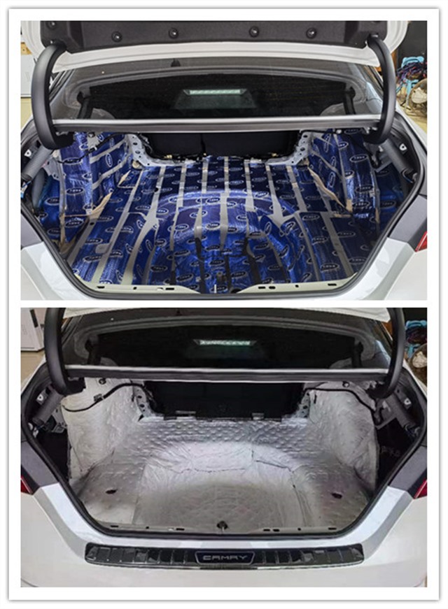 由于尾箱是后輪轂噪音和排氣噪音的主要通道,通過尾箱會傳入大量的噪音及燥熱。而豐田凱美瑞的原車尾箱沒有任何的隔音處理,薄弱的鈑金更容易將噪音傳遞到駕駛室,長時間的震動也會導(dǎo)致尾箱的鈑金強(qiáng)度下降,所以使用大能藍(lán)金剛進(jìn)行第一層止震處理,將材料均勻地粘貼在鈑金表面,增加鈑金厚度,抑制鈑金振動,最后使用超級溫莎,吸收尾箱及輪轂部分的各類高頻噪音。