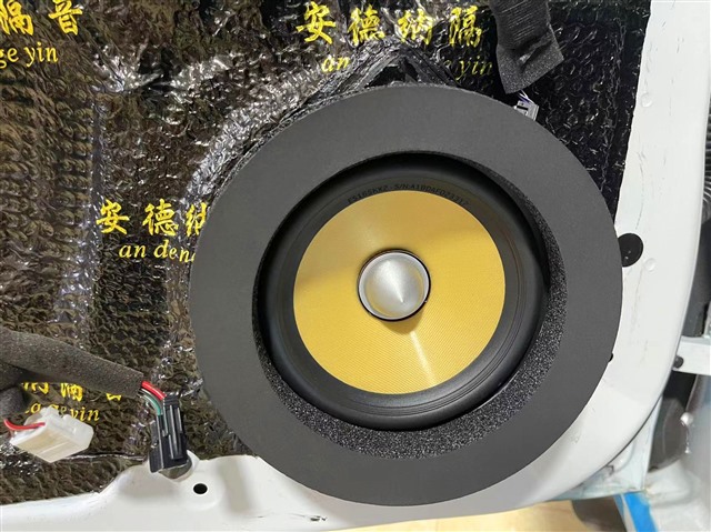 勁浪黃盆KX2中低音喇叭無損安裝在前門板,安裝時還加裝了美音圈,能填充原車內飾板和喇叭間的間隙,讓聲音集中向車內傳出,而不會四周發散。