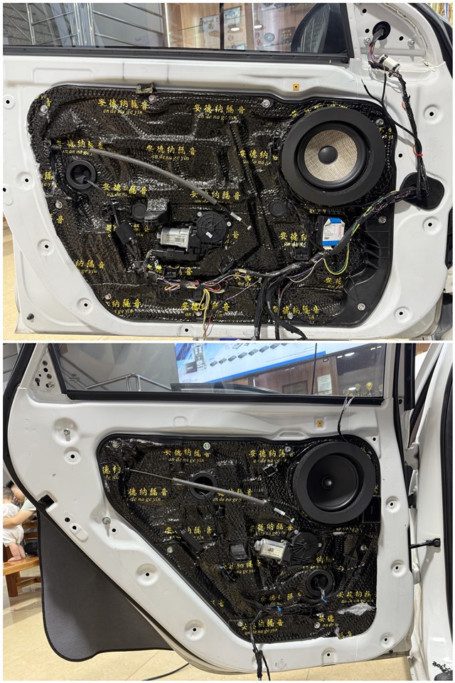 我們對(duì)前后門板進(jìn)行了專業(yè)隔音處理,有效減少行駛中的外界噪音干擾,為音響系統(tǒng)創(chuàng)造純凈的發(fā)聲環(huán)境,并且使所有改裝均保持原車風(fēng)格,門板復(fù)原后看不出任何改裝痕跡。