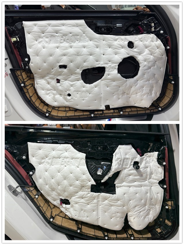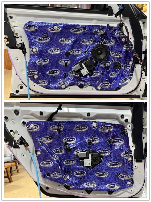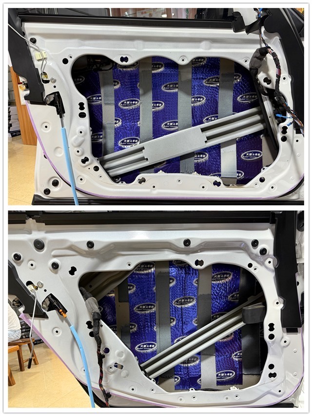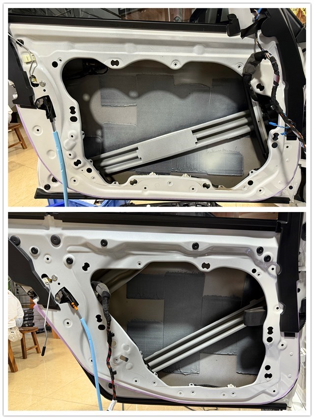 粘貼隔音材料前,將前后門板的鈑金表面徹底清潔干凈,確保粘貼效果