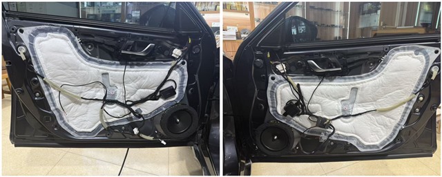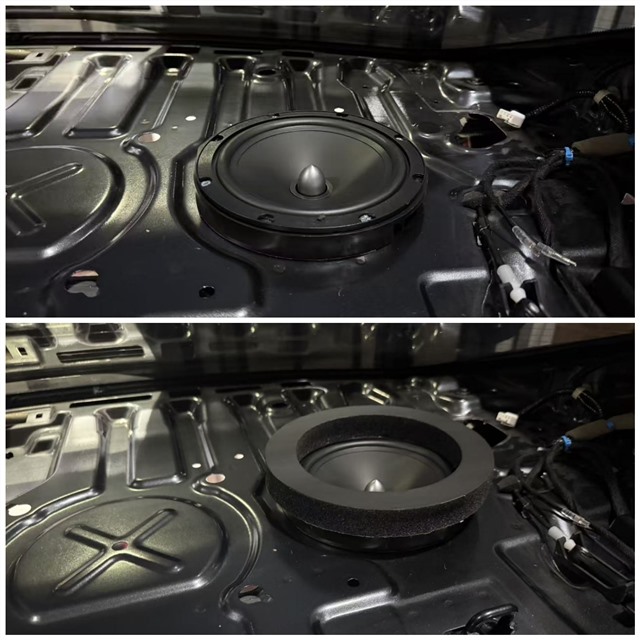 安裝完高音后,為前門(mén)板原位無(wú)損安裝了勁浪ASE-165的中低音喇叭。安裝過(guò)程中,特別為每只喇叭加裝了美音圈,能防止聲音向四周擴(kuò)散,使聲音集中向前發(fā)出,達(dá)到更好效果,讓車(chē)門(mén)形成一個(gè)理想的音箱腔體,提升中低頻的力度和彈性。