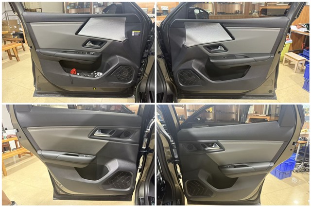 原車門板僅有一層簡單的塑料防水膜,無法有效隔音降振,更無法為喇叭提供一個理想的發(fā)聲環(huán)境。我們首先清除原廠隔音材料,然后使用大能超級盾進(jìn)行四門雙層隔音處理。