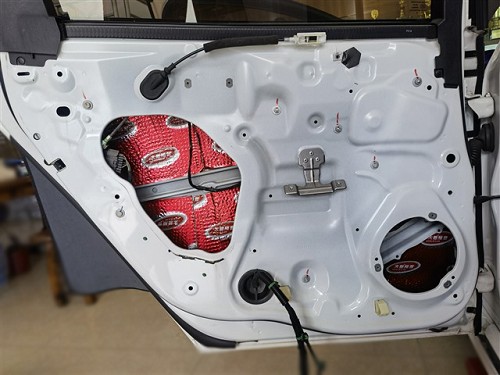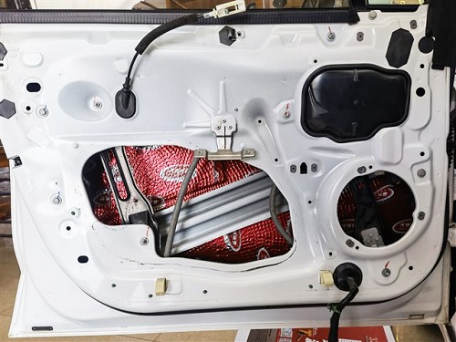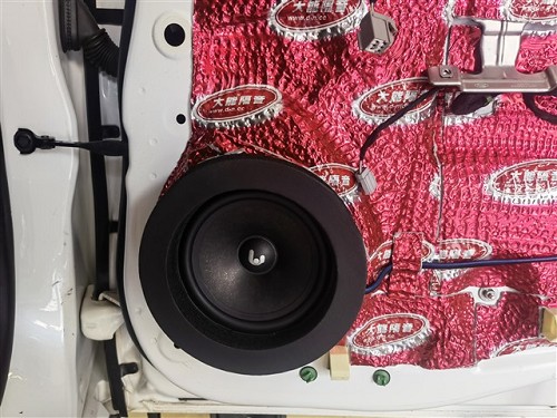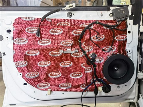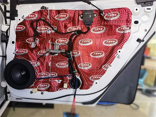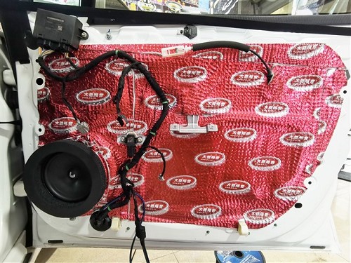 優秀的聲音表現離不開安靜的工作環境,使用了大能紅派隔音材料對汽車的門板做了三層隔音處理,提升門板的隔音效果,同時也為門板上安裝的喇叭提供了良好的工作環境。