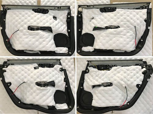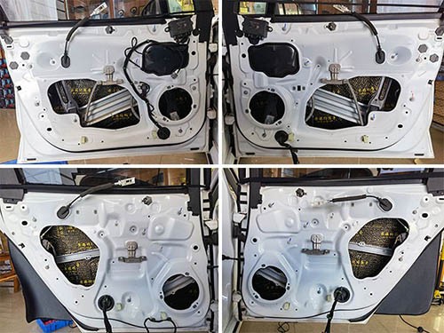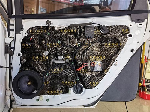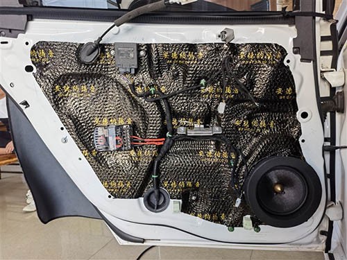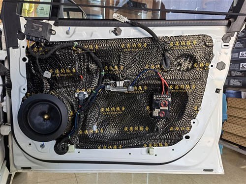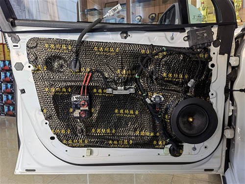 原車門板隔音措施較為簡單,風噪很容易通過門板傳入到車廂內部。因此改裝技師使用安德納+吸音棉,對門板及飾蓋做了三層的隔音處理。這就像是為聲場喇叭制作了一個密封的箱體一般,有效阻止了風噪的傳入,為聲場喇叭創造了一個良好的工作環境。