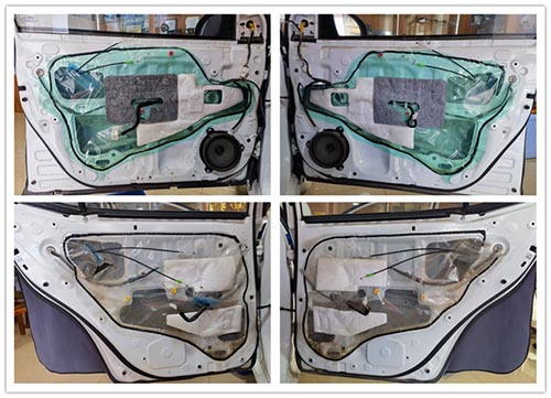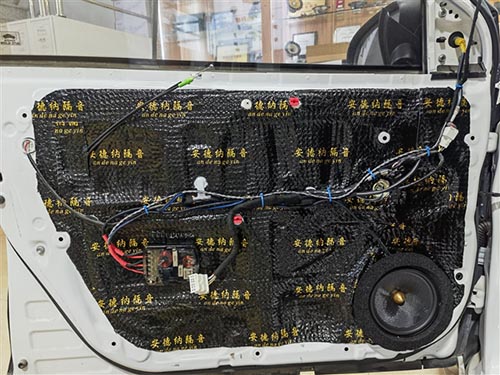 原車門板鈑金結構單薄,內部空洞較大,導致門板部位會產生很大的噪聲。改裝師先使用安德納隔音材料對門板進行內外層隔音,降低門板自身產生的共振噪聲,并且密封門板上多余的空洞,阻止風噪的傳入。