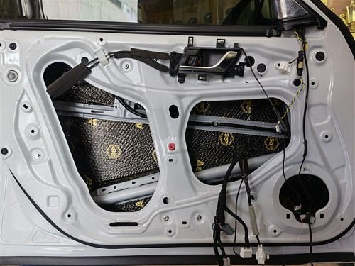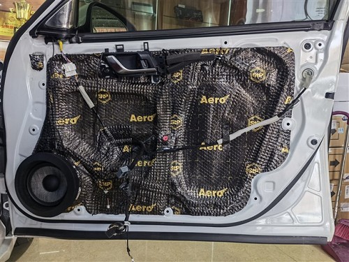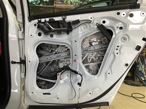 四門隔音對(duì)于聲場喇叭的音質(zhì)是有提升的,隔音后將門板形成一個(gè)密閉的箱體,提升音質(zhì),再者還可降低風(fēng)噪。針對(duì)噪音特點(diǎn),改裝師前門使用俄羅斯StP航空炸彈,后門使用俄羅斯StP小炸彈,將隔音材料緊密貼合鈑金,使得隔音效果達(dá)到最佳。