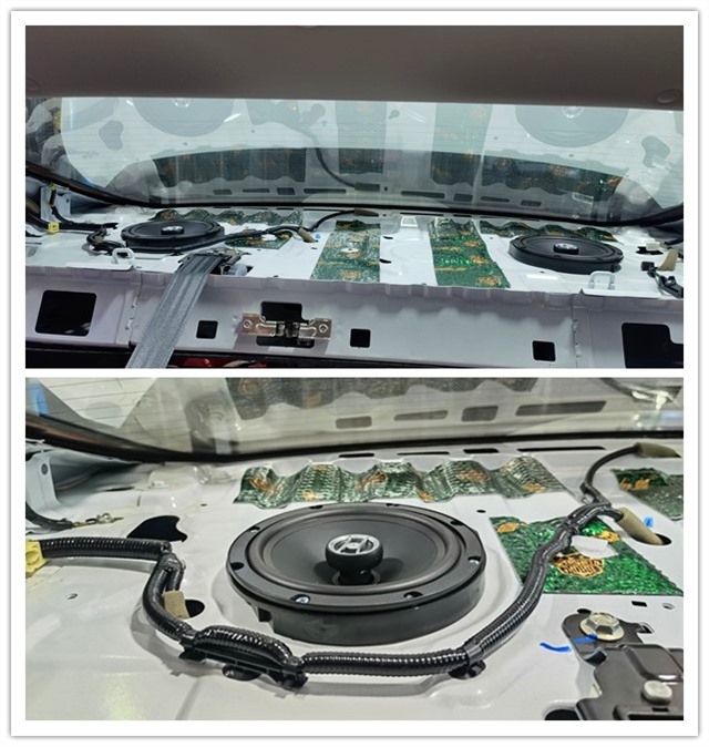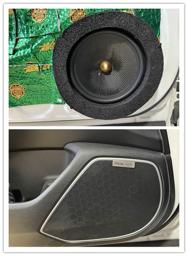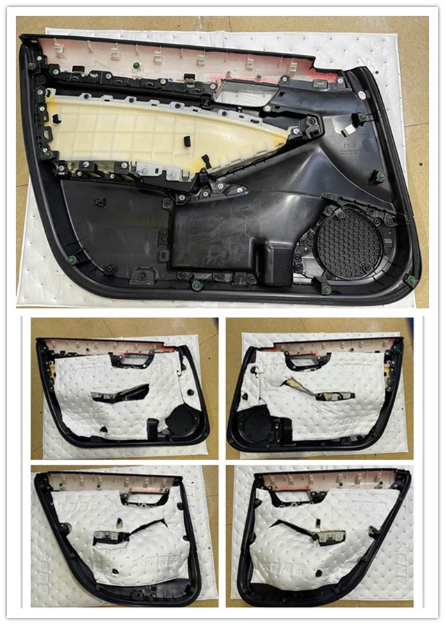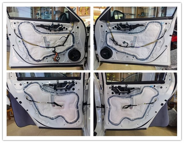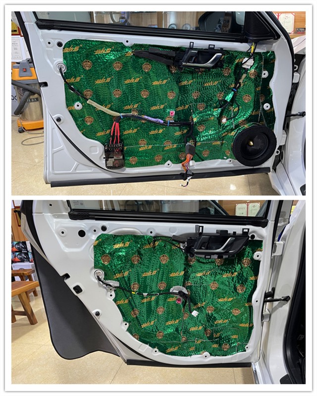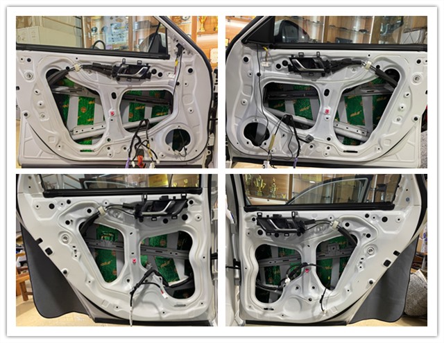 由圖可見,原車門板內部只有一層簡單塑料薄膜,最多能防水浸入里面,很難起到良好的隔音效果。在改裝音響前,必須對車門做隔音,這是大家都應該知道的了!我們改裝師將原車塑膠材料清除后,使用大能超級盾隔音材料對門板做雙層隔音處理,有效減少門板自身振動噪聲以及風噪對音響品質的干擾,為聲場喇叭創造一個良好工作環境。