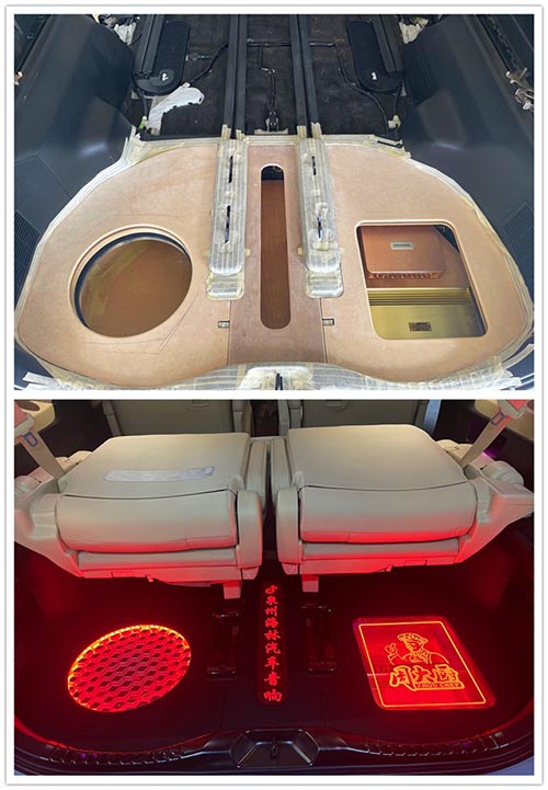 通過精湛的尾箱工藝設計,改裝師將功放等器材與低音炮合理擺放在尾箱中,再添加燈光效果后,不但非常實用,其中絢麗的燈光也非常具有觀賞效果