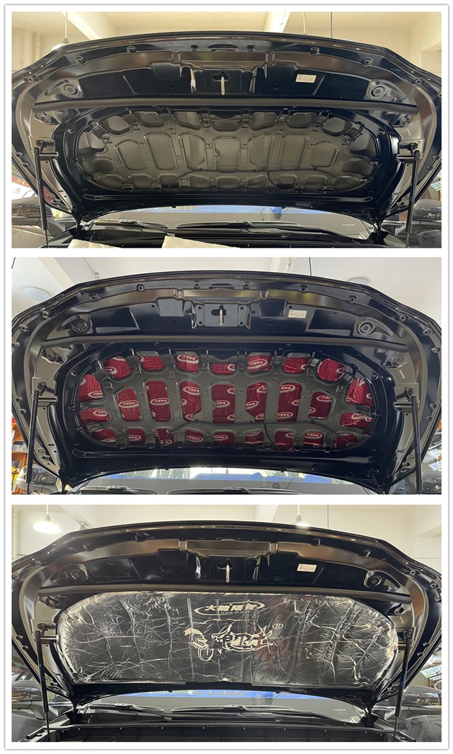 車主為了擺脫令人厭惡的汽車噪音,于是選擇了我們推出了高性價比的大能紅派專車定制隔音方案。改裝師將套餐內的隔音材料全準備完畢,先開始對引擎蓋進行隔音處理。因為汽車在行駛的過程中,發動機艙內會產生大量的噪聲和熱量。對引擎蓋槽進行隔音處理,既可以降低了發動機艙內的噪聲傳入車廂,也可以隔熱,防止漆面脫落,保持汽車外表的美觀。