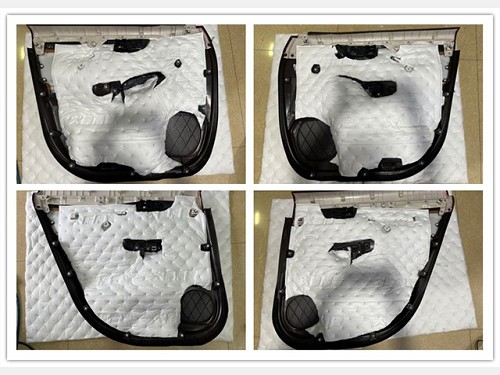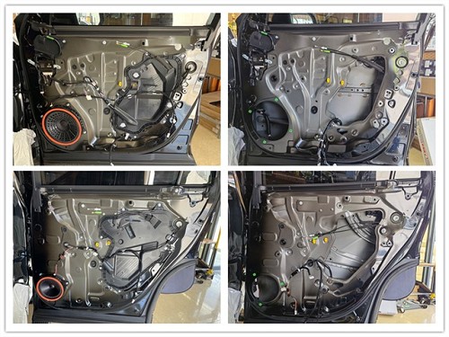 原車門板鐵皮結構拆開飾蓋可以看到,門板的隔音措施較少,而且又有較多的空洞結構,風噪和門板震動的噪音很容易就傳入車內。因此改裝師對門板進行三層隔音處理。汽車門板的隔音處理一方面能夠降低噪聲,而另一方面又能增強鈑金剛性。改裝師先用大能紅派對門板進行雙層隔音處理,主要起的是止振密封的作用,再使用超級溫莎對門板飾蓋進行第三層隔音處理,將車廂打造成一個結實的音箱。