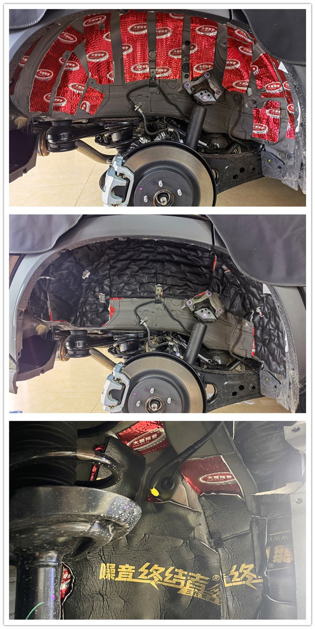 除了共振噪聲以外,胎噪同樣也不容忽視。泉州海林的改裝師先使用大能紅派對汽車的輪弧做了第一層的止振處理,然后又使用噪音終結者對汽車的輪弧做了第二層的密封處理,雙層的隔音處理直接切斷了胎噪的傳播途徑,減少了胎噪的傳入。
