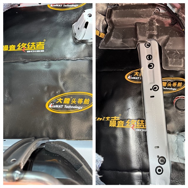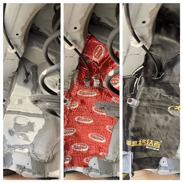 底盤與尾箱是整車噪音傳遞的核心通道,技師將車體相關(guān)部位徹底拆解,露出原生鈑金。對(duì)比施工前后的狀態(tài),原車幾乎無有效隔音措施,而升級(jí)后,底盤與尾箱均鋪設(shè)大能紅派隔音與超級(jí)蕰莎,雙層防護(hù)有效抑制鈑金共振,阻隔路噪與尾排噪音。