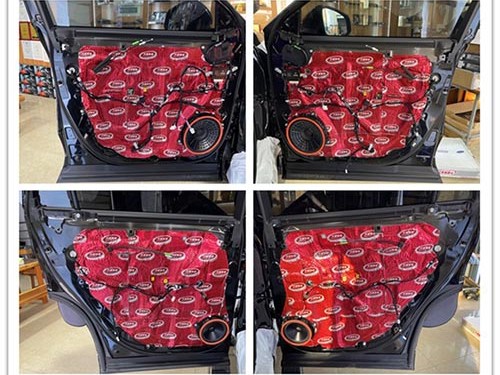 原車門板鐵皮結構拆開后可以看到,門板的隔音措施較少,且有較多的空洞結構,風噪和門板震動的噪音很容易傳入車內。因此,改裝師對門板進行了三層隔音處理。這不僅能降低噪聲,還能增強鈑金剛性。改裝師先用大能紅派對門板進行雙層隔音處理,主要起止振密封作用,再使用超級溫莎對門板飾蓋進行第三層隔音處理。