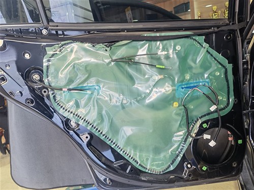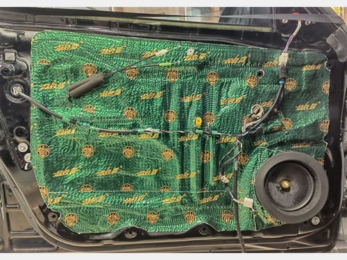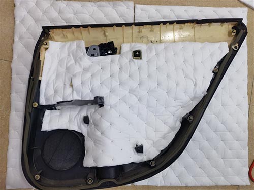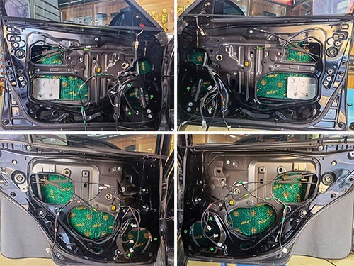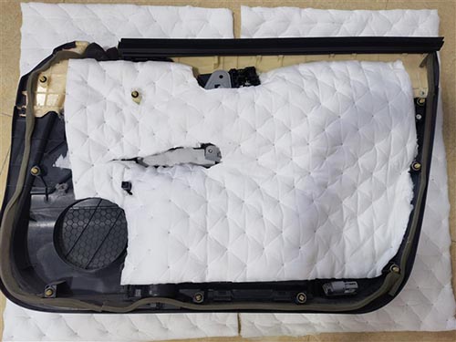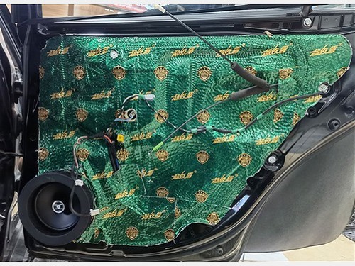 銳志原車門板內部只有一層塑料薄膜,撕掉后會看到十分空洞的鈑金結構,難以起到良好隔音效果。海林改裝技師使用大能超級盾隔音材料,對門板內層做第一層止震處理,降低門板自身共振噪聲;對門板做第二層做密封處理;飾蓋滿貼吸音棉,用料十足。三層隔音形成一個隔音箱的作用,完美把風噪擋在門外,給車內一個安靜的聽音樂環境。